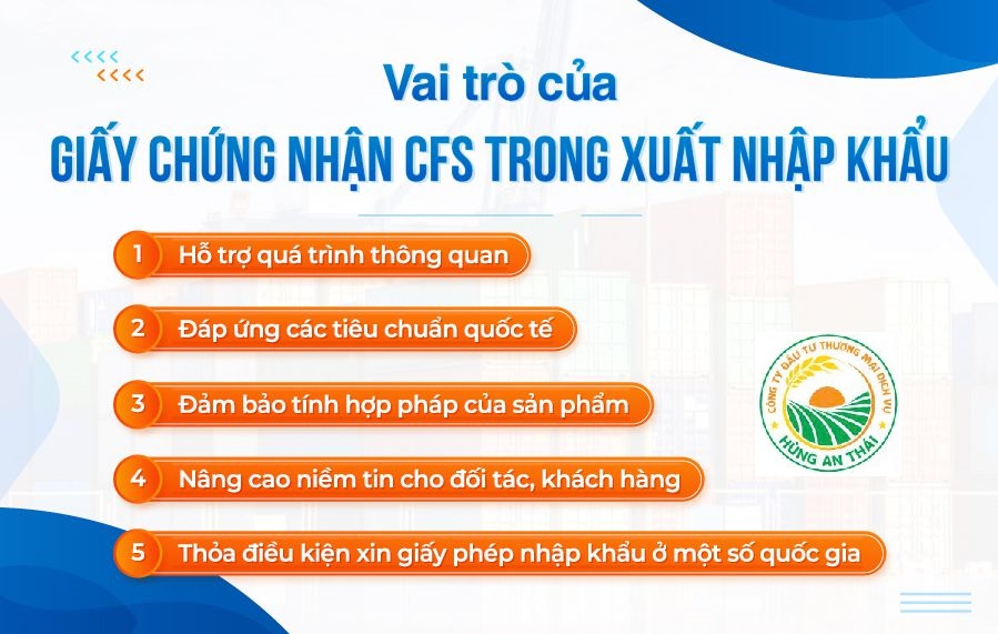Vai trò của giấy chứng nhận CFS là gì trong xuất nhập khẩu? Đây là một câu hỏi then chốt đối với mọi thương nhân tham gia giao thương quốc tế. Chúng tôi, Công Ty TNHH Đầu Tư Dịch Vụ và Thương Mại Hùng An Thái, hiểu rằng chứng nhận CFS đóng vai trò tối quan trọng, từ việc đơn giản hóa thông quan đến nâng tầm uy tín doanh nghiệp, cũng như những lưu ý thiết yếu bạn cần nắm rõ để đảm bảo mọi quy trình diễn ra suôn sẻ.